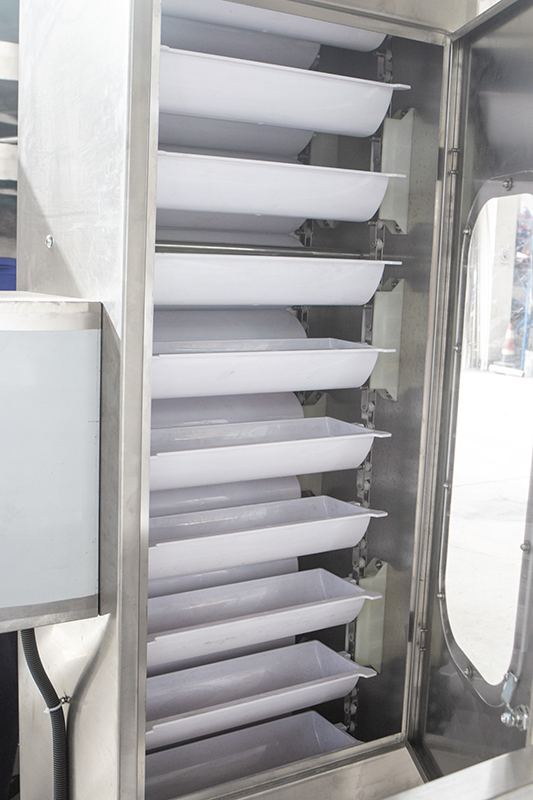 結(jié)構(gòu)、工作原理及使用特點:本機由烘箱、振動底座、自動上料機構(gòu)、抽濕裝置、冷卻裝置、連接風管、蒸汽換熱器、風機等組成。當蒸汽進入換熱器后進行熱交換,產(chǎn)生高溫干燥熱空氣通過強力風機的作用,由下而上進入烘箱,同時物料在自動吸料機構(gòu)的作業(yè)下自頂部進入烘箱,熱空氣與物料在烘箱內(nèi)進行逆流交換,物料在振動電機的作用下沿阿基米德螺旋線翻滾走動,并與熱風充分接觸,從而達到干燥效果。烘箱上部連接吸濕裝置,及時排除烘焙時產(chǎn)生的濕氣。烘箱內(nèi)裝有網(wǎng)板,以滿足不同大小的物料烘干要求。全自動振動烘干設備最大特點是能源能充分利用、工作連續(xù)性好、物料干燥均勻、生產(chǎn)量大、操作方便、衛(wèi)生條件好、易清洗、易維護、適用范圍廣。整機均由全不銹鋼制作,符合GMP要求。本機適用于烘干帶濕潤水的物料,不適合烘干含有結(jié)合水的物料。